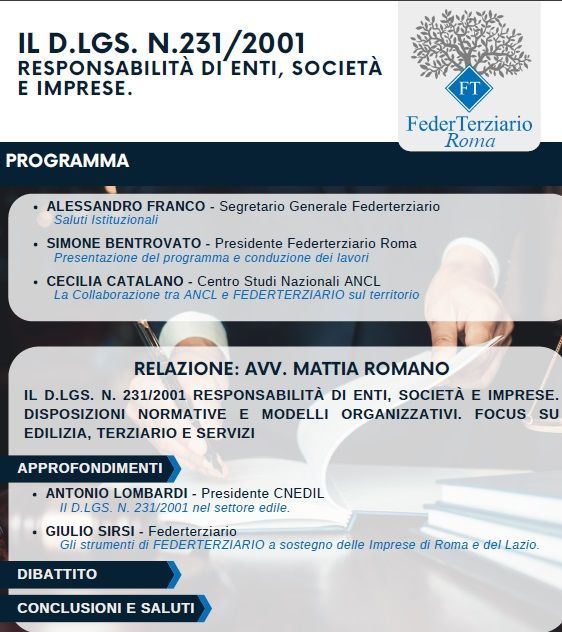 L'Avv. Mattia Romano è stato invitato da FederTerziario - Roma ad affrontare, davanti ad una platea di imprenditori, le tematiche collegate alla responsabilità degli enti ex D.Lgs. 231/01.